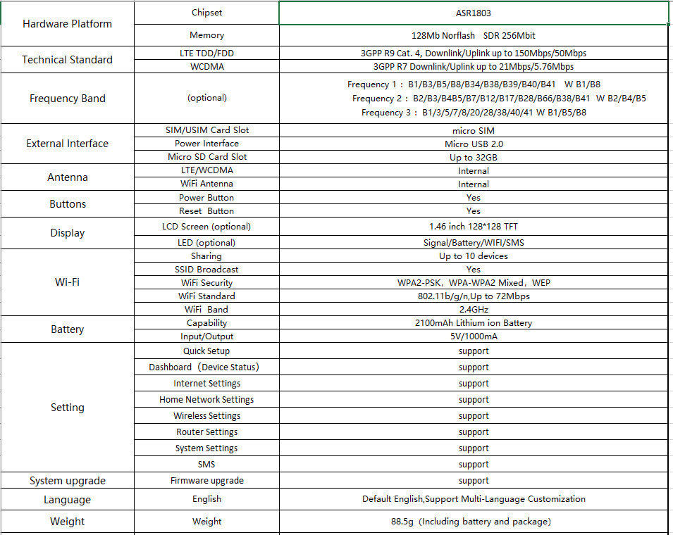LTE 업로드 | 150Mbps | 보안체 | WPA/WPA2-PSK, WEP |